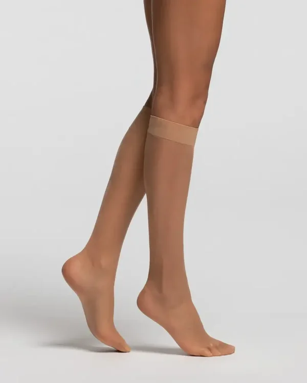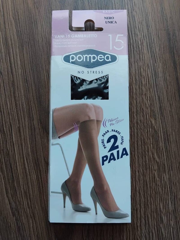 15-Denier-Kniestrümpfe in transparenter, blickdichter und massierender Bernsteinfarbe mit leichter Kompression, die ein Gefühl von Leichtigkeit vermittelt. Die Pompea-Kniestrümpfe haben nackte Zehen, sind pflegeleicht und leicht zu waschen. Im Paket sind zwei Paar Kniestrümpfe enthalten.
